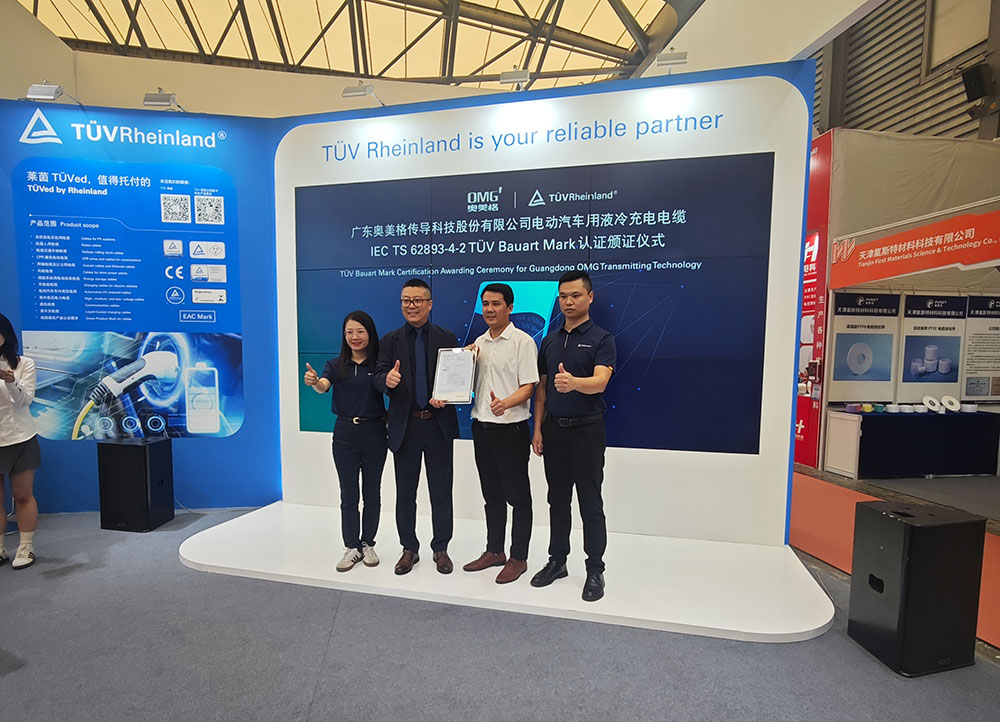 TÜV held a certification ceremony for OMEG’s liquid-cooled charging cable for electric vehicles, conforming to IEC TS 62893-4-2.